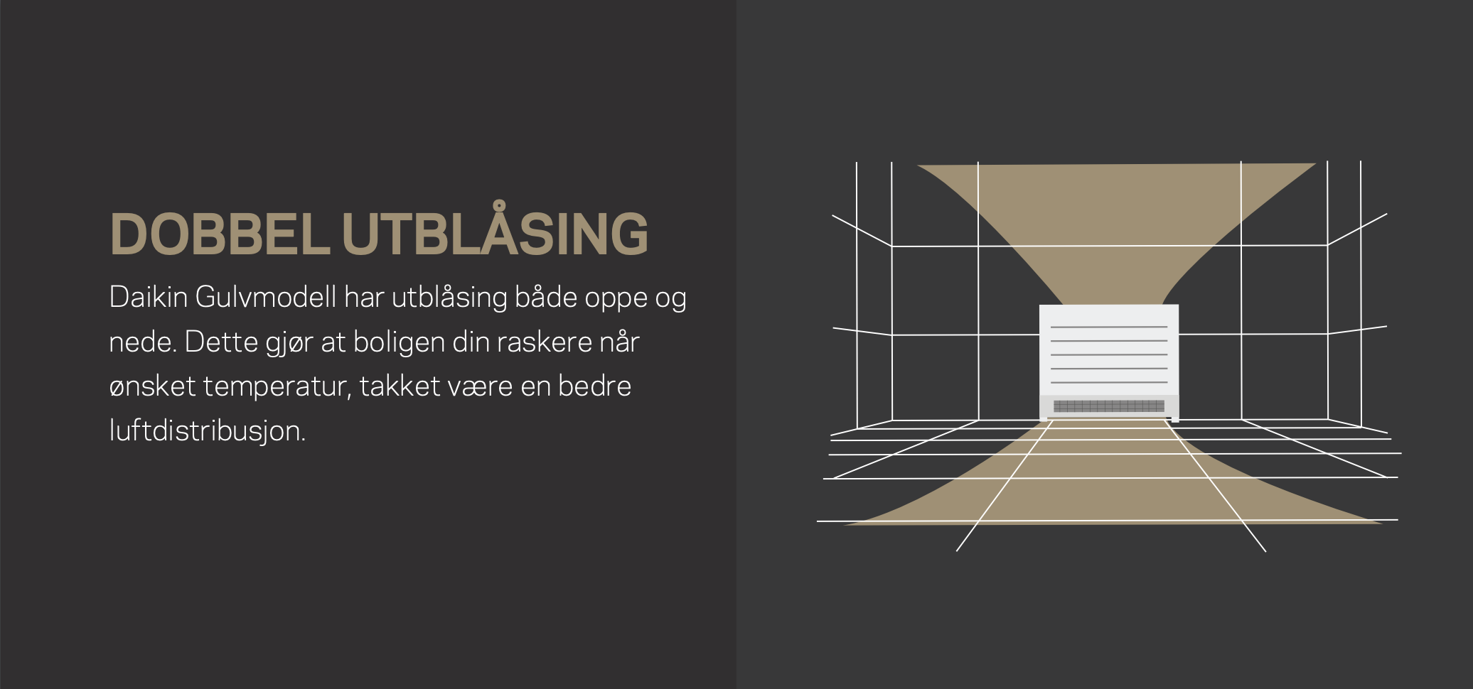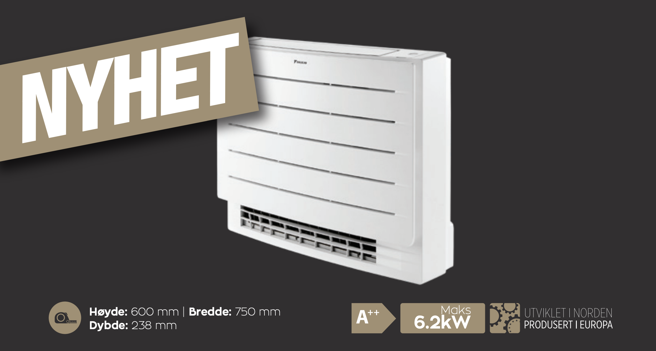 Daikin Gulvmodell er en enda råere og kraftigere gulvmodell enn forgjengeren. Den nye gulvmodellen har fått et moderne design som passer inn i ethvert hjem. I tillegg til utblåsing nede ved gulvet og på toppen av maskinen, har den nye modellen også fått Heat Boost. Heat Boost sørger for at ønsket temperatur nås 14% raskere ved oppstart enn med tradisjonelle varmepumper. Daikin sin nyeste modell er også blitt utstyrt med den unike Flash Streamer luftrenseren, innebygget Wifi-styring og talestyring ved hjelp av Google Home eller Amazon Alexa. Denne modellen har virkelig alt.